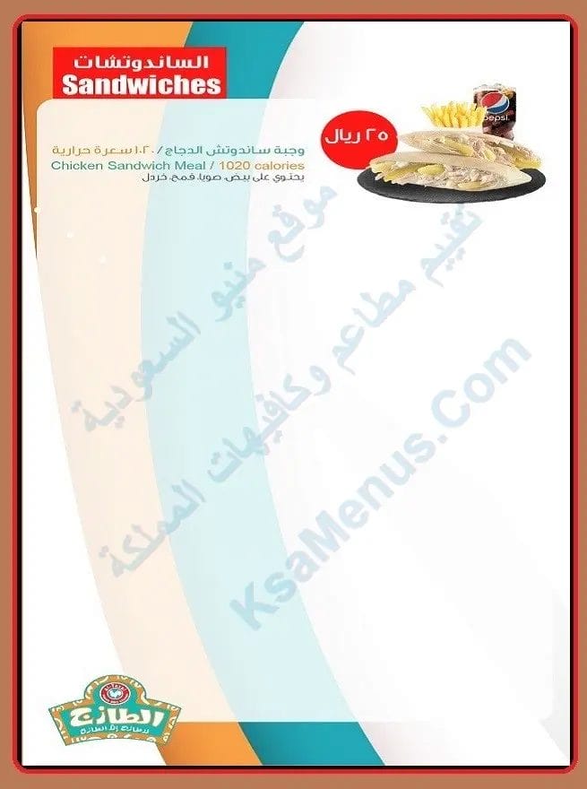 منيو الطازج الرياض يقدم قائمة وجبات تحتوي على اكل نظيف و مذاق لذيذ. المنيو متنوع يشمل أصناف الفروج والدجاج المشوي والمقلي. لا ننسى منيو الطازج ساندوتش وبروست وكرسبي رول الشهي جداً. كما يقدم منيو مطعم الطازج أكلات سعودية أصيلة مثل الكبسة والمندي. تكمل قائمة الطعام مع مجموعة آخري من الصوصات والمقبلات اللذيذة.