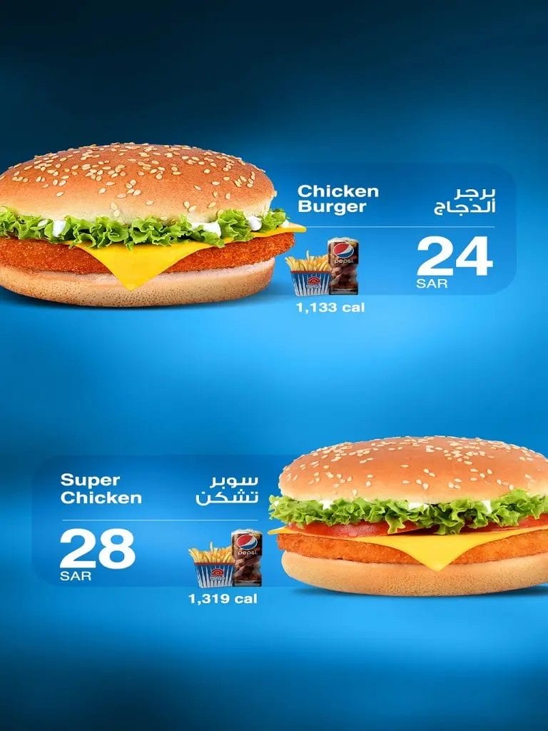 - سعر وجبة تشيلي الدجاج وسط + سوبر تشكن ساندوتش هو 46 ريال سعودي.