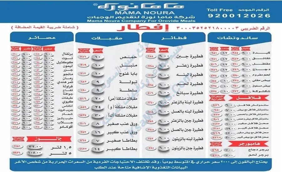 منيو ماما نورة | أسعار المنيو الجديد كاملة بعد الضريبة