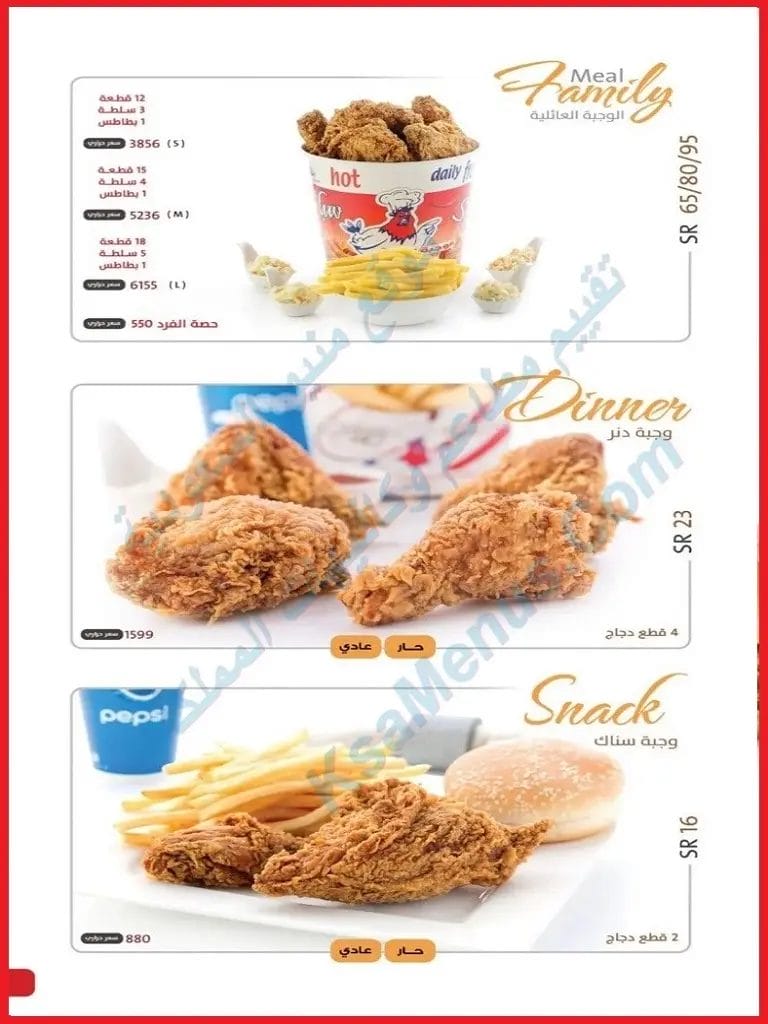 - أسعار الوجبة العائلية حجم كبير هي 96 ريال سعودي. ١٨ قطعة دجاج بالعظم مع ٥ سلطة كول سلو وبطاطس كبير.