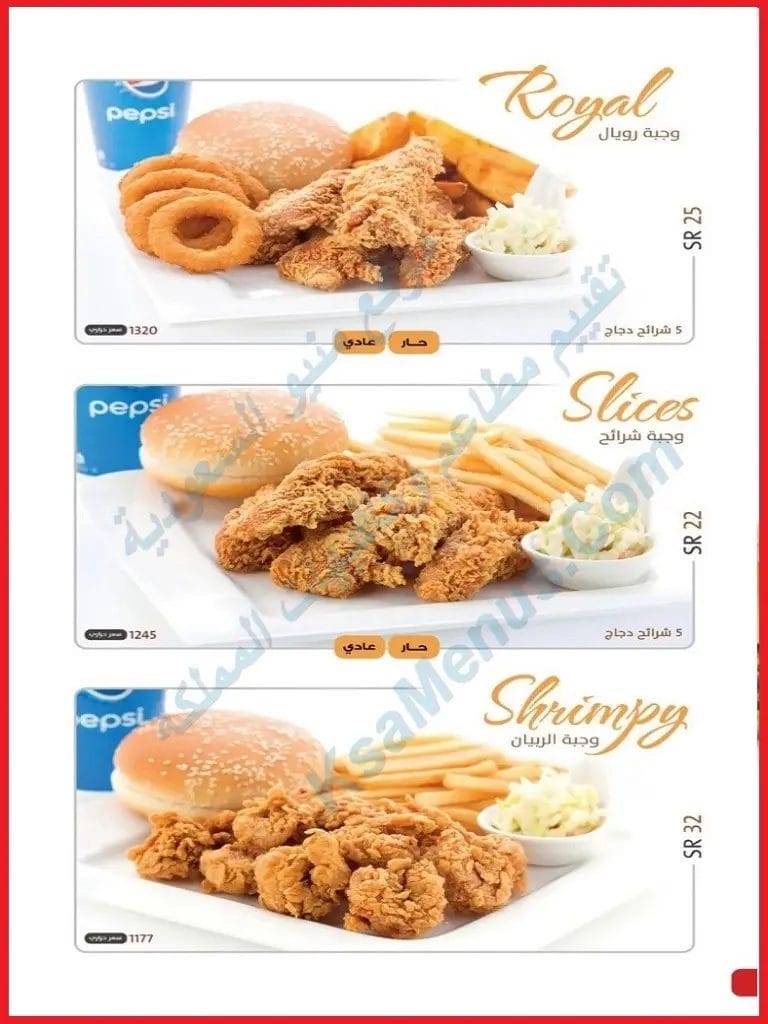 - أسعار وجبة رويال هي 26 ريال سعودي. عدد 5 شرائح الدجاج مع بطاطس الودجز وسلطة الملفوف وحلقات البصل المقرمش واختار بين مشروبات غازية أو عصير أو ماء.