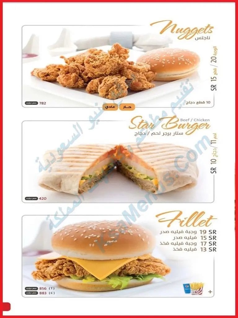 - أسعار برجر ستار لحم أو دجاج هي 11 ريال سعودي.