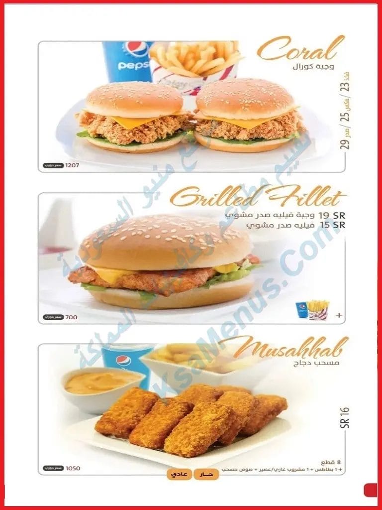 - أسعار وجبة كورال (فخذ- فخذ) هي 24 ريال سعودي. ساندويشين فلية فخذ مع بطاطس واختار بين مشروبات غازية أو عصير أو ماء.