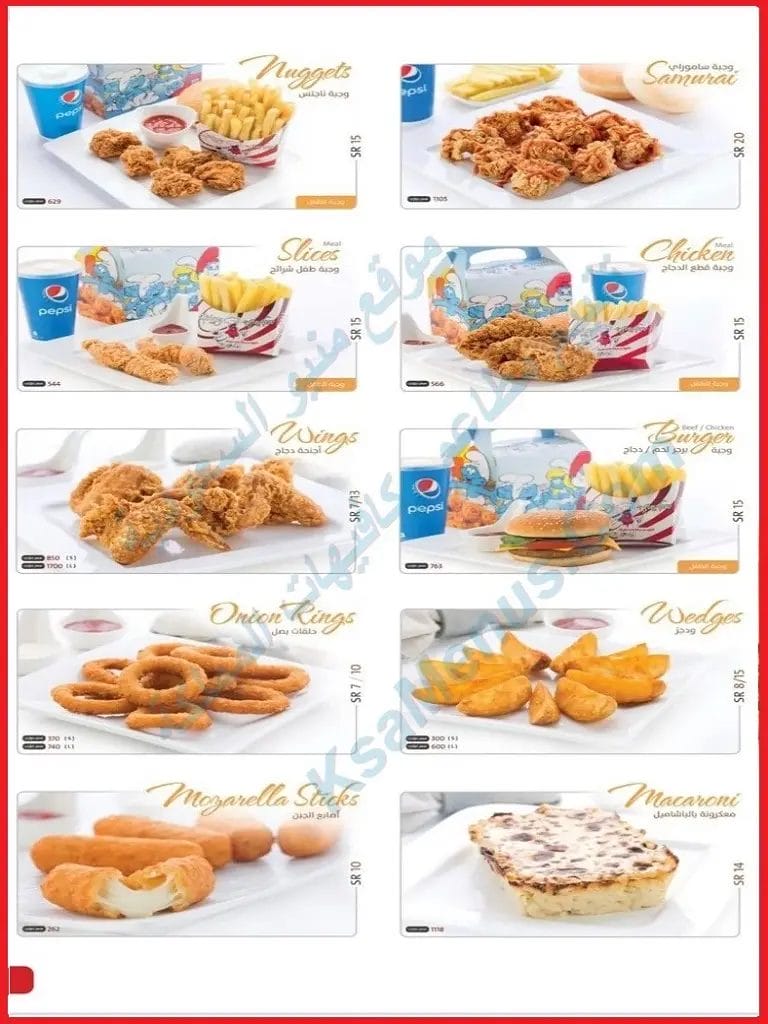 - أسعار وجبة ساموراي هي 21 ريال سعودي. عدد 8 قطع دجاج مع بطاطس واختار بين مشروبات غازية أو عصير أو ماء.