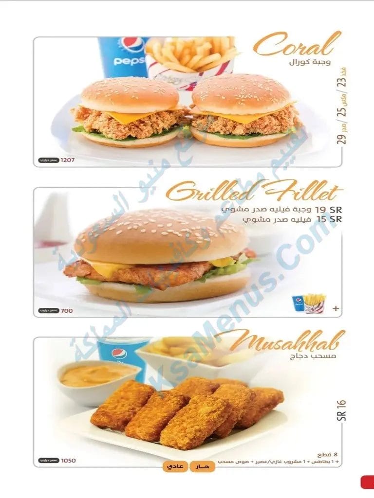 - سعر كورال مكس (صدر + فخذ) هو 26 ريال سعودي. ساندويشين فلية فخذ +فلية صدر مع بطاطس مع بيبسي أو ماء أو عصير.